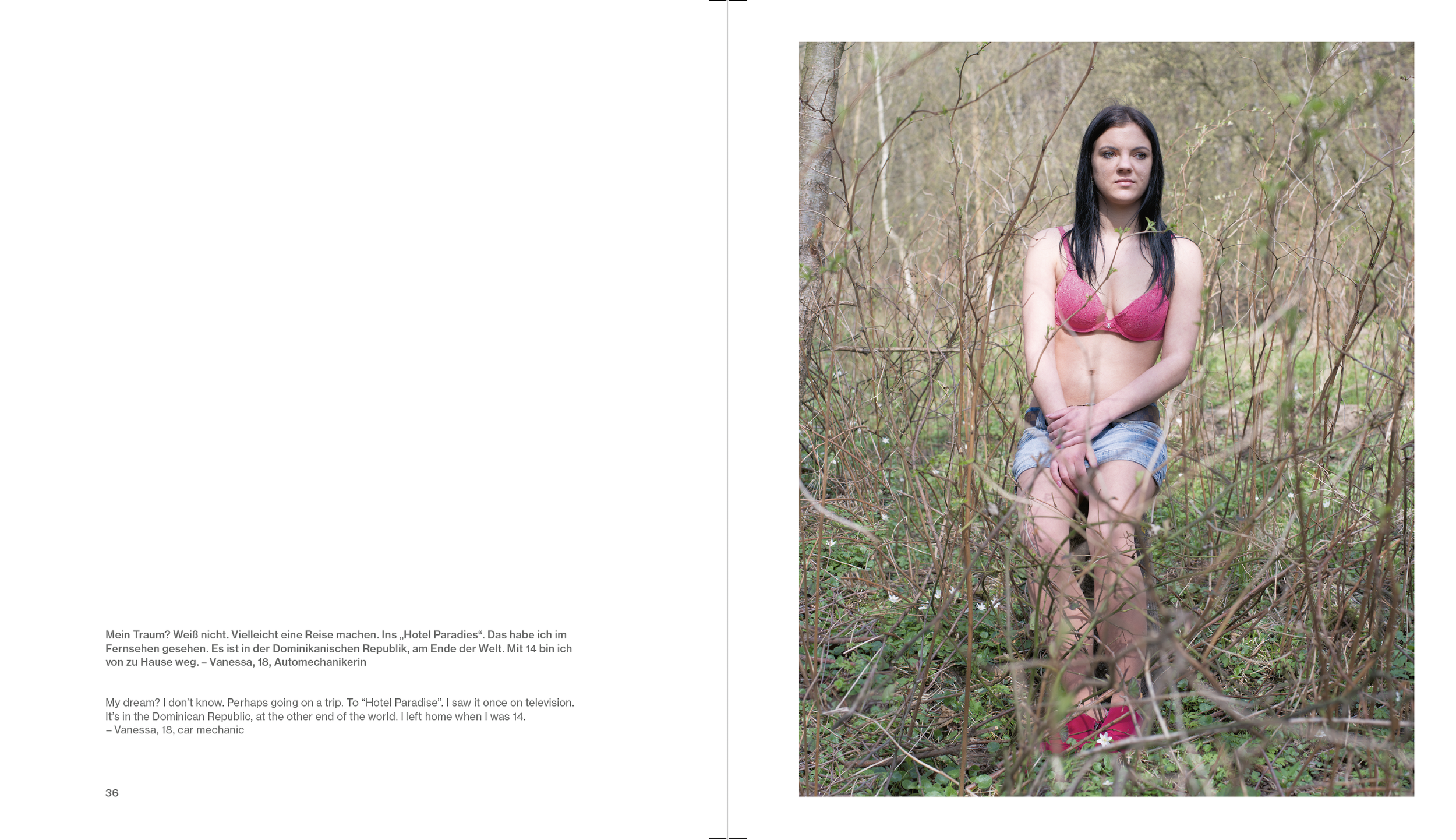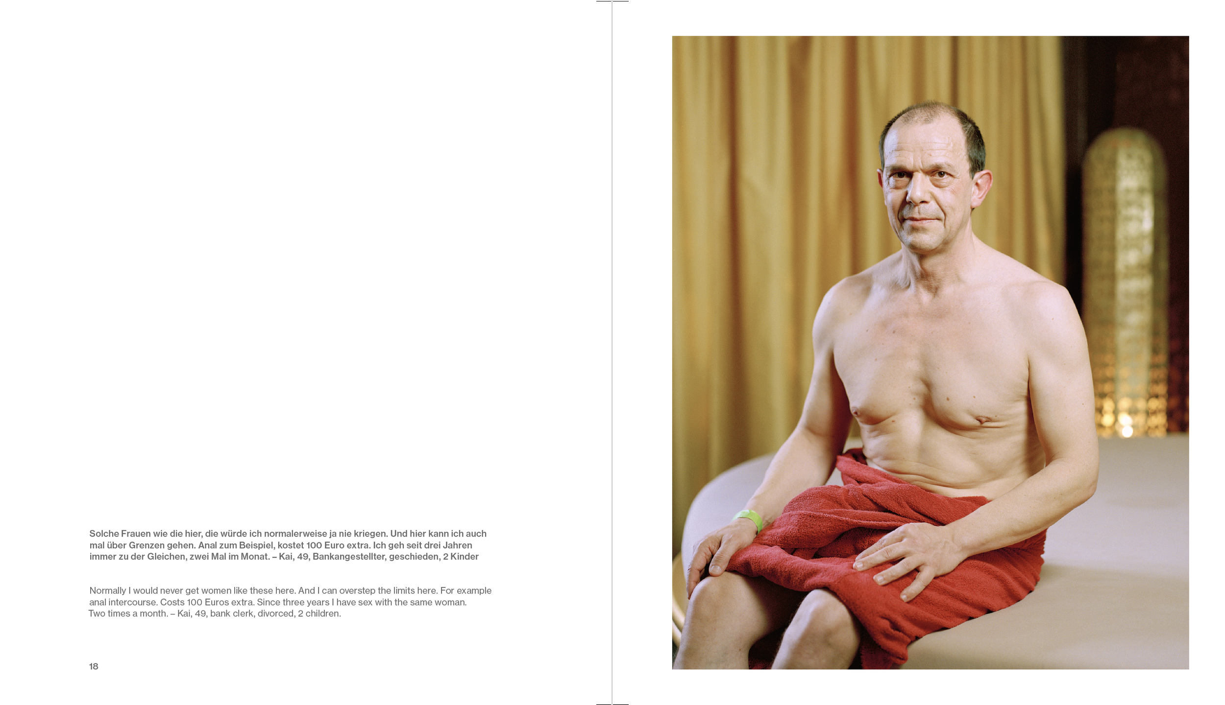 Is prostitution a violation of human dignity or a profession like any other? Photographer Bettina Flitner explores prostitution in Germany today. She portrays the women, but also, for the first time, the men who purchase “sexual services.” And she shows the places where this happens, from a large brothel to “Service Boxes.”